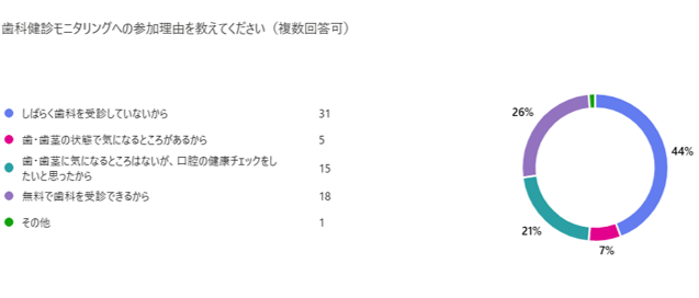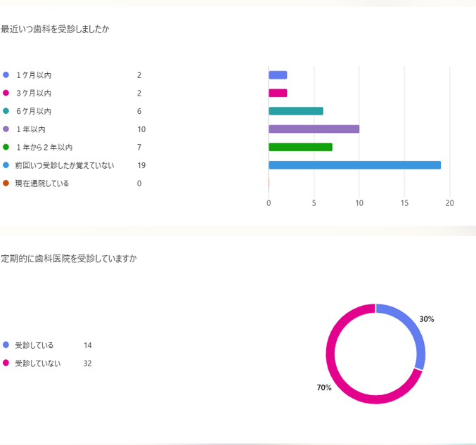 今回の健診では、「定期的に歯科受診をしていない」と回答された方が全体の約70%を占めており、受診の結果「虫歯や歯周病の治療が必要である」と診断された方も複数確認されました。
