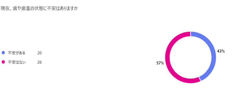 2024年度には「歯や歯茎の状態に不安がある」と回答した方が過半数を占めていましたが、2025年度上期ではその割合が43%に減少し、「不安はない」と回答した方が57%と、良い傾向が見られました。